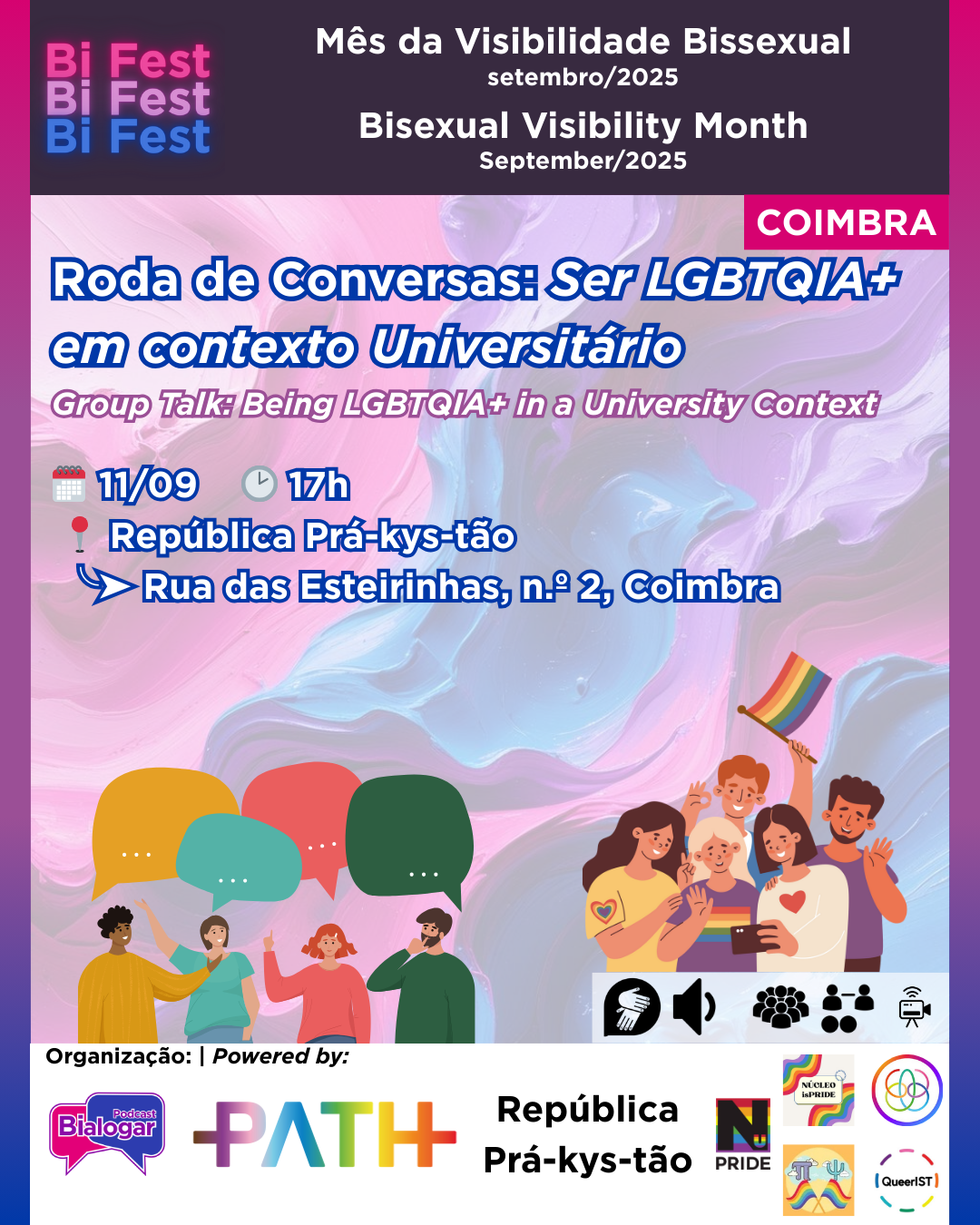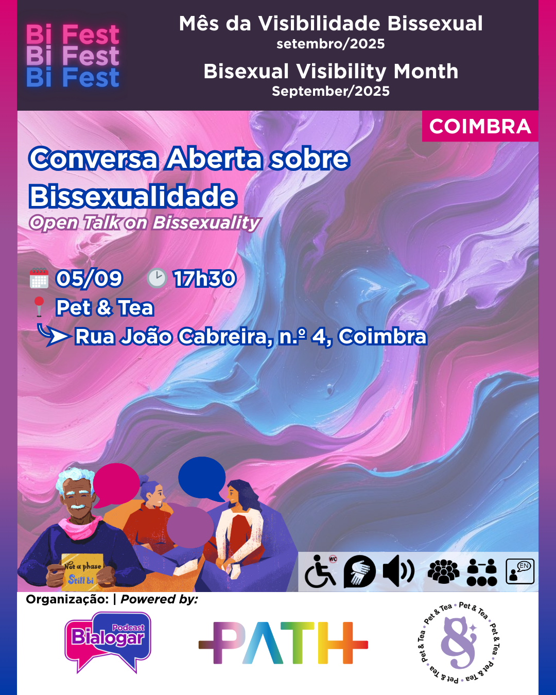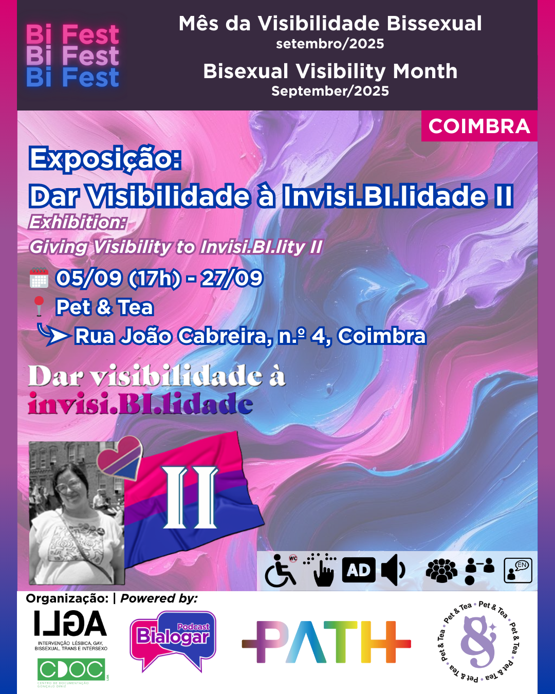 A Exposição “Dar Visibilidade à Invisi.BI.lidade II”, composta por fotografias, textos, poesia, pinturas e desenhos, pretende homenagear ativistas, figuras históricas, celebridades e pessoas Bissexuais+ em geral, servindo como um meio para criar visibilidade para um comunidade tantas vezes invisibilizada.